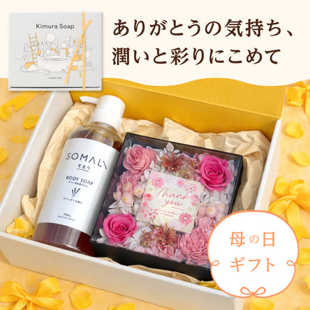 SOMALIボディソープ/ハンドソープとBOXフラワーのギフトセット。4/28以降のお届けです。